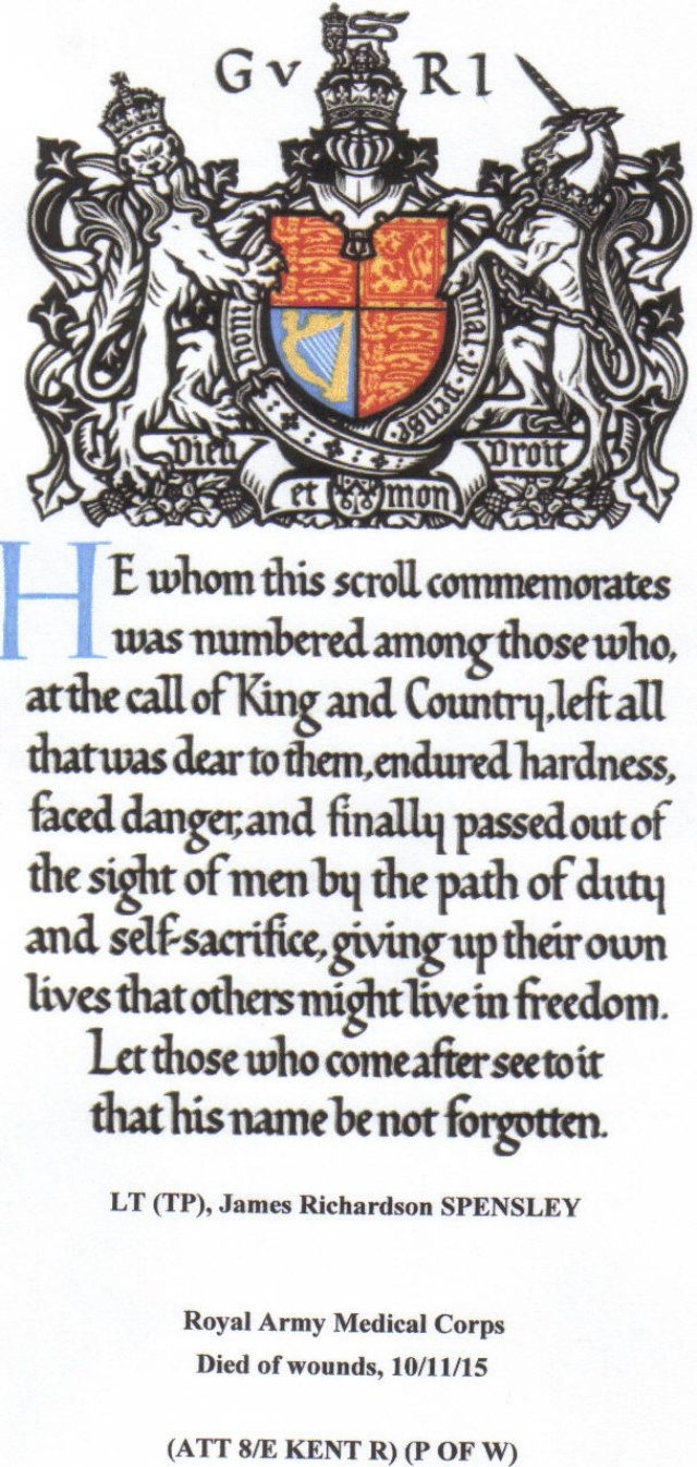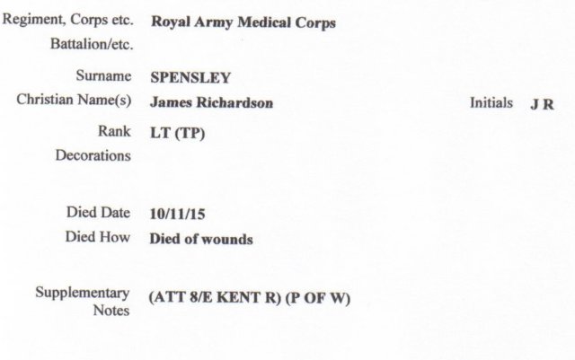 James Richardson Spensley was the son of the Rev. William Spensley and wife Elizabeth Alice Richardson. He was a doctor who worked in Genoa, Italy and is credited with the introduction of soccer to that country, and one of their junior championships is named for him. He also introduced scouting to Italy. He joined the British Army in WWI sailing for France, with the battalion on 31 Aug 15 and was captured on 26th Sep 15 to die at Mainz 10 Nov 15 of injuries received. Although RAMC he was attached (as were many doctors) to an infantry battalion , the 8th East Kent Regiment known as The Buffs, which deployed with a brigade that fought at the Battle of Loos late Sep 1915. (Chris Best)