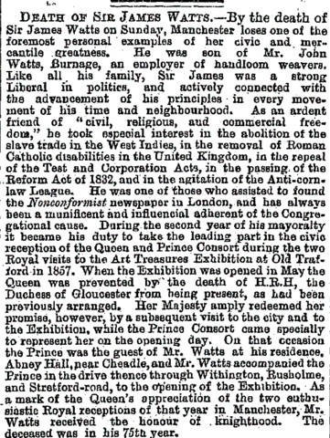 Niece of Sir James Watts of Abney Hall, Cheshire, manufacturer, warehouse owner. Entertained Queen Victoria.